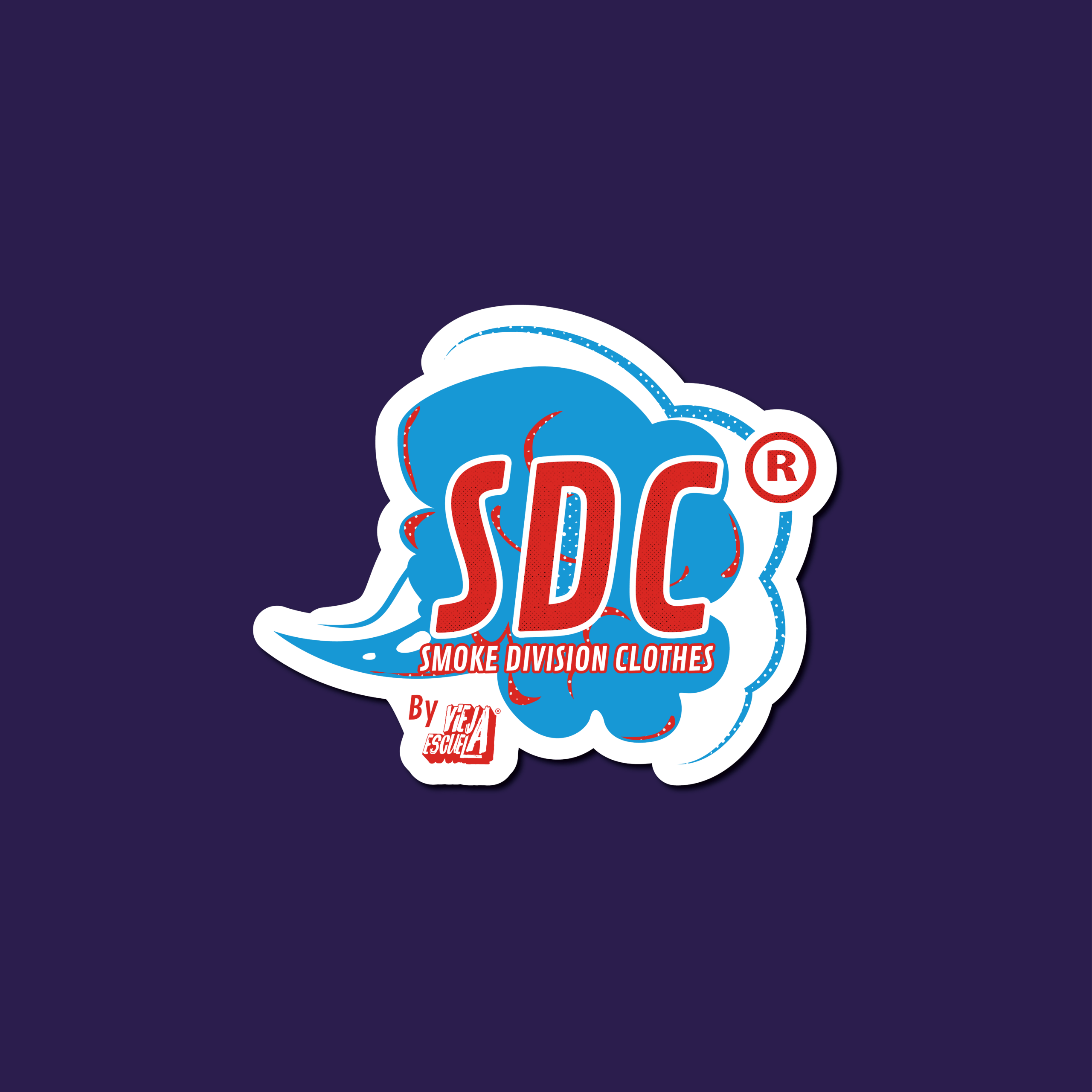Sticker oficial de la marca Smoke Division Clothes (SDC) con el logotipo en composición central. Presenta las siglas SDC en tipografía robusta y dinámica en color rojo con detalles gráficos, integradas sobre una nube de humo en tonos celeste y azul que refuerza la identidad urbana de la marca.