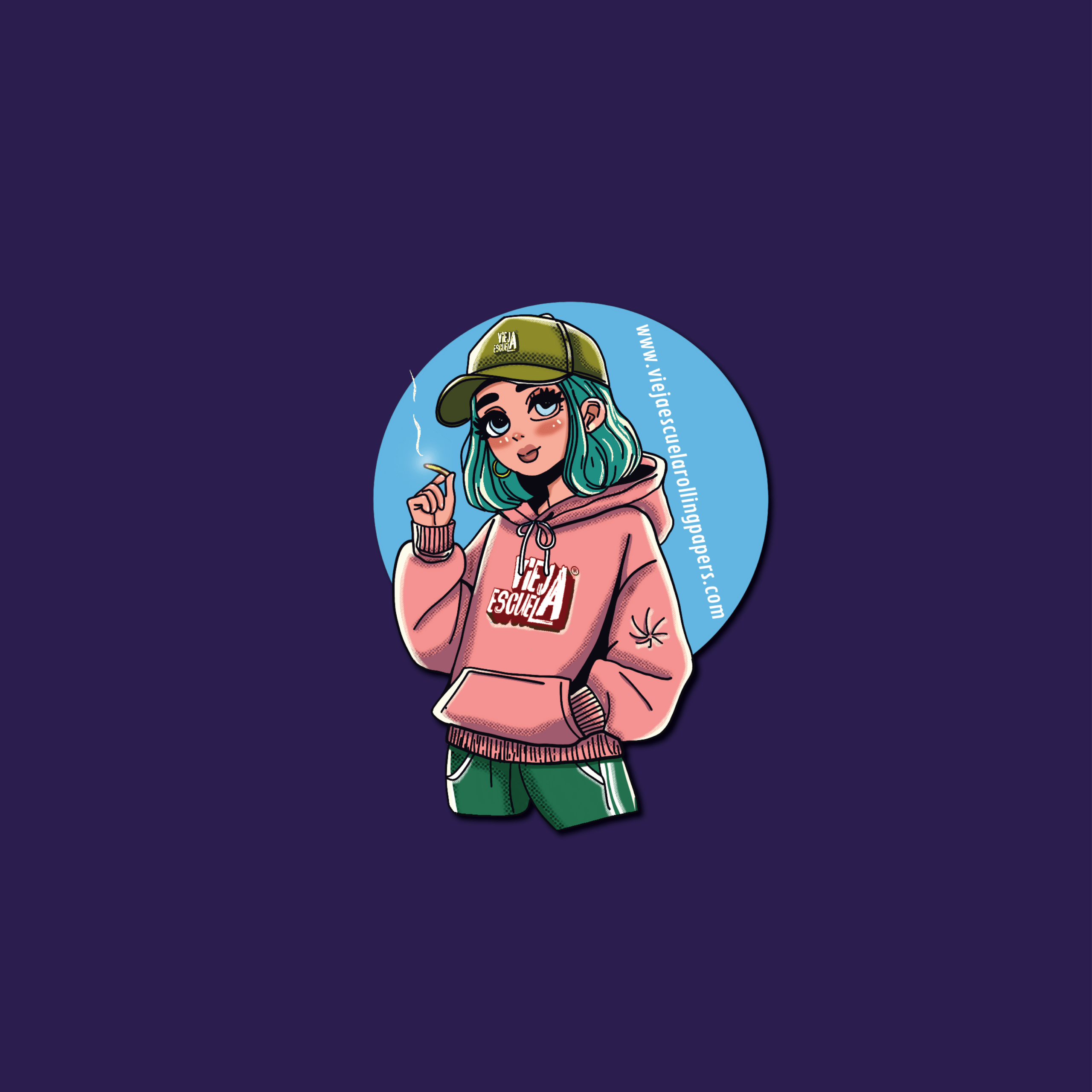 Sticker oficial de la marca con ilustración central estilo cartoon/anime de la chica Vieja Escuela. El diseño muestra al personaje con gorra verde con el logo, cabello en tono verde agua, buzo rosa con estampa “Vieja Escuela” en el pecho y short verde deportivo. Sostiene un cigarrillo armado del que se eleva una línea sutil de humo, reforzando la identidad rolling de la marca.