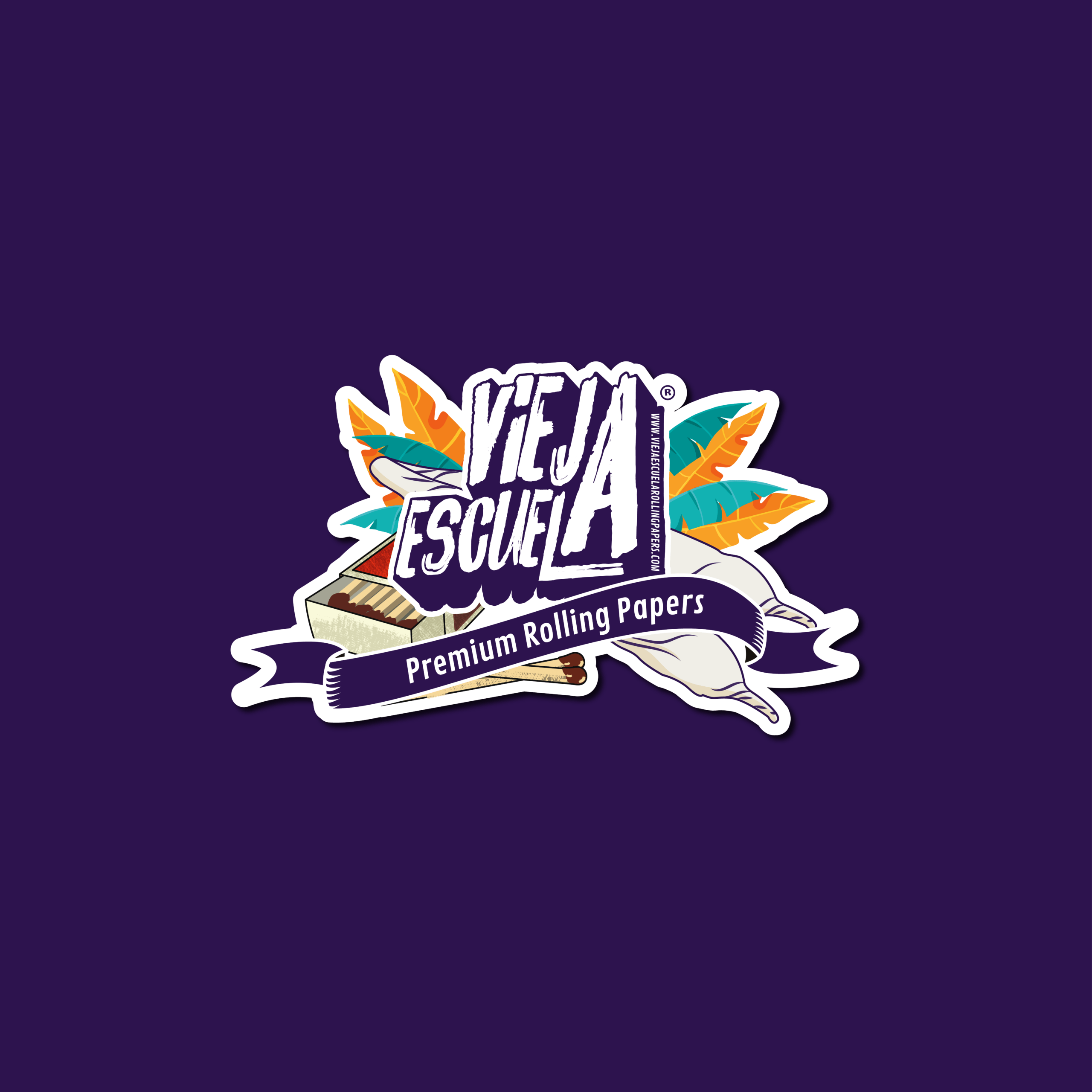 Sticker oficial de la marca con el logotipo Vieja Escuela en composición central, acompañado de elementos gráficos icónicos: hojas ilustradas, caja clásica y cinta inferior con la leyenda “Premium Rolling Papers”.